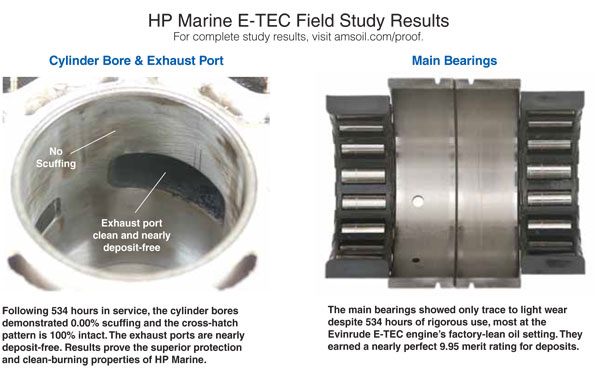 AMSOIL tested HP Marine in a torturous real world study in the twin E-TEC engines of a marine towing boat. The test subjects were a set of 250-horsepower Evinrude engines converted to the “factory lean setting”. One engine used AMSOIL HP Marine, while the other used Evinrude XD-100 oil. The outboard engines were then put to work for 500 hours and then torn down. The engine parts were evaluated by an independent test agency. The result was that AMSOIL HP Marine Injector Oil performed flawlessly in the E-TEC engine with the demanding factory lean setting. Read more about this testing in the articles below.